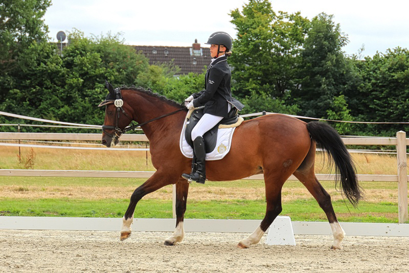 Zur Grundausbildung gehört auch das Reiten im Gelände, inklusive Training auf der Hügelbahn, an kleinen Naturhindernissen und bei Wasserdurchritten. Besonders gern besuchen wir den nahegelegenen Süseler Reiterpark und genießen die Zeit dort.